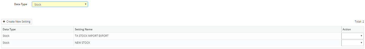 •Data Type – Upon entering the DB Import/Export section of Settings, the system will first prompt for the data type for which the user wishes to create a setting, followed by a list of all import and export settings currently in existence. Upon selecting a data type from the drop-down list, the display of current settings is reduced to only those for that data type: