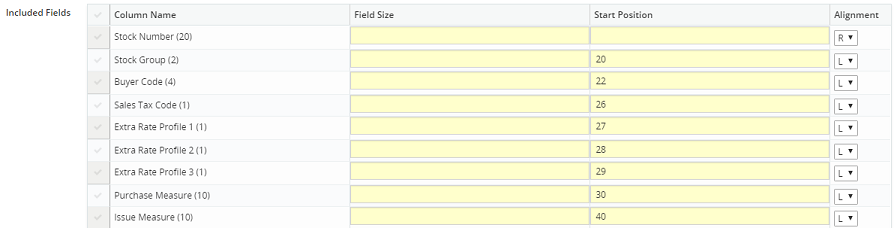 •More notes on fixed width files – The table that displays the included fields will contain extra columns when the setting style is fixed width. These extra columns are: Field Size, Start Position and Alignment.