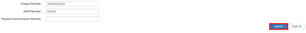 2. Enter one or more of the following fields: Cheque Number, MICR Number and/or Pay Authorization Number.