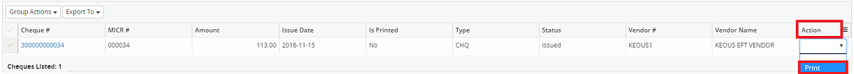 4. Click on the Action drop-down menu beside the corresponding cheque and select Print.