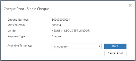 5. If applicable, in the Cheque Print- Single Cheque dialog box, click on the Available Templates drop-down menu to select an alternative option.