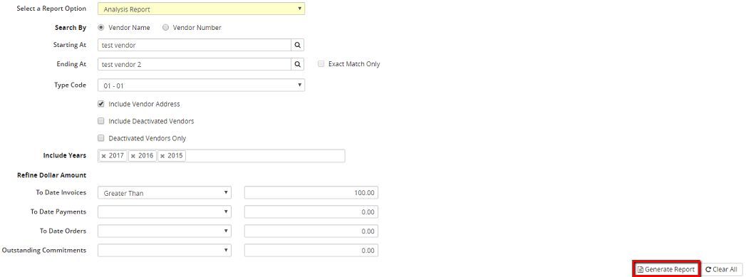 9. Click on the Generate Report button, or click on the Clear All button to remove all input information and reset the fields to their default values.