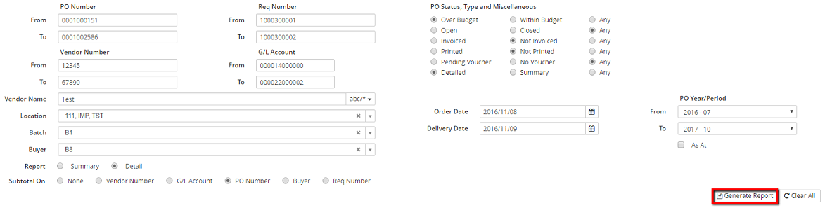 Note: If the Detail radio button is selected, the Subtotal On section will become available. Select one of the following radio buttons: None (selected by default), Vendor Number, G/L Account, PO Number, Buyer, or Req Number.