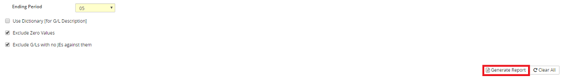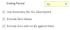 3. If applicable, select any of the following selection boxes: Use Dictionary [for G/L Description], Exclude Zero Values, and/or Exclude G/Ls with no JEs against them.