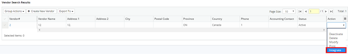 4. Click on the Action drop-down menu beside the corresponding vendor and select Integrate.