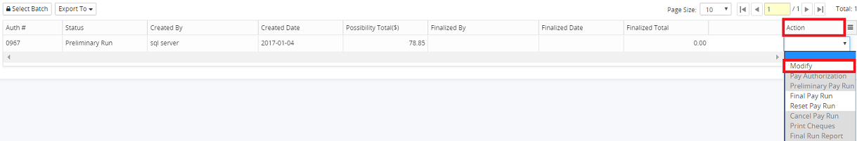 4. Click on the Action drop-down menu, beside the corresponding pay run and select Modify.