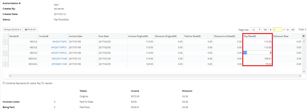 Note: 'Global' payment changes can be made to multiple invoices by using the Group Actions options: Delete, Pay in Full or Pay None.