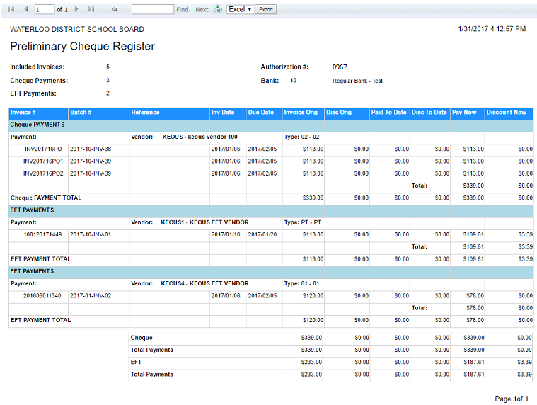 Note: Invoices in the Preliminary Cheque Run report are grouped and displayed by Bank # order.