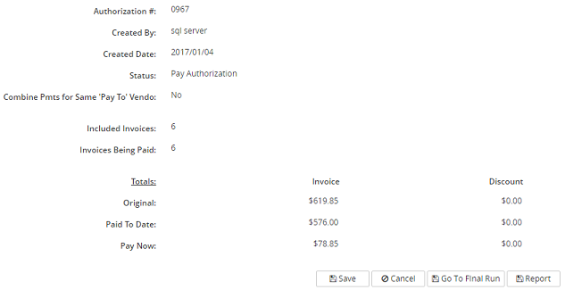 The Preliminary Run can be performed in Pay Run Management. This is a mandatory step in the Accounts Payable process. A Preliminary Cheque Run report that lists all the invoices included in the pay run will be generated and should be checked for potential errors, prior to proceeding to the Final Pay Run. Any necessary corrections may be made in Payment Authorization and the Preliminary Run must be run again for the authorization batch before proceeding to the Final Pay Run.