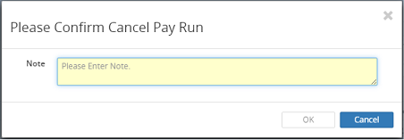 9. In the Please Confirm Cancel Pay Run dialog box, enter a note in the Note field.