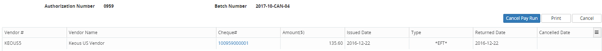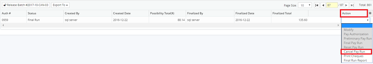 A pay run that has completed the Accounts Payable process (from Payment Possibilities to the Final Cheque Run) may be cancelled using the Cancel Pay Run action. The cheque run will be reversed and system generated reversing entries will be created; cheque headers and detail lines will be deleted, and all invoices will be disassociated from the authorization.