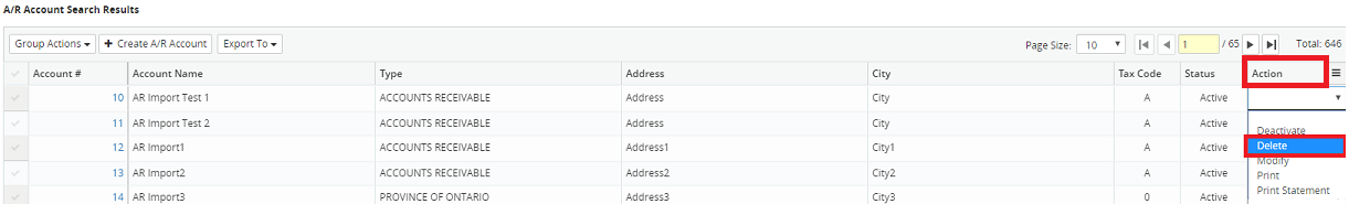 4. Click on the Action drop-down menu beside the corresponding A/R account and select Delete.