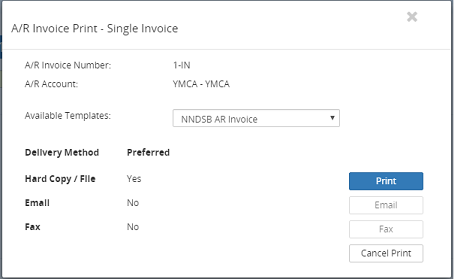 23. If Save & Print is selected, if applicable, in the A/R Invoice Print- Single Invoice section, click on the Available Templates drop-down menu to select an alternative option.
