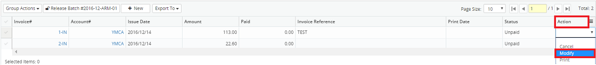 8. Click on the Action drop-down menu beside the corresponding A/R Invoice and select Modify.