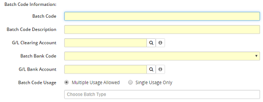 •The Batch Bank Code is not used in all instances; however, a valid Bank Code must be selected. A '00' bank code may be created for this purpose.