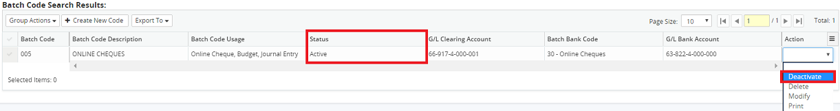 Note: Activate action will be available when batch code Status is Inactive. Deactivate action will be available when batch code Status is Active.