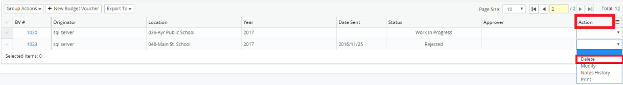 7. Click on the Action drop-down menu beside the corresponding budget voucher and select Delete.