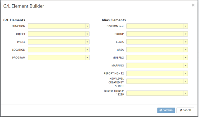 5. In the G/L Element Builder dialog box, under the G/L Elements section, click on each of the element drop-down menus to select an option.