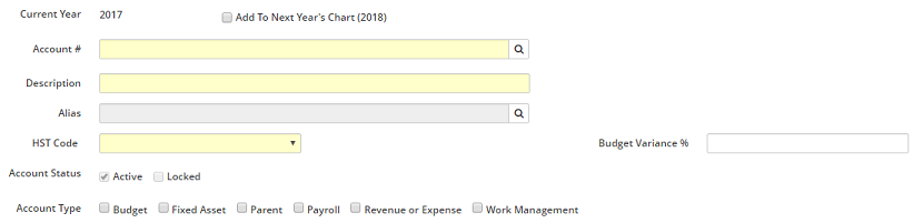 When a Chart of Accounts for the following year has been created, the option to add the new G/L account to Next Year Chart of Accounts is available.