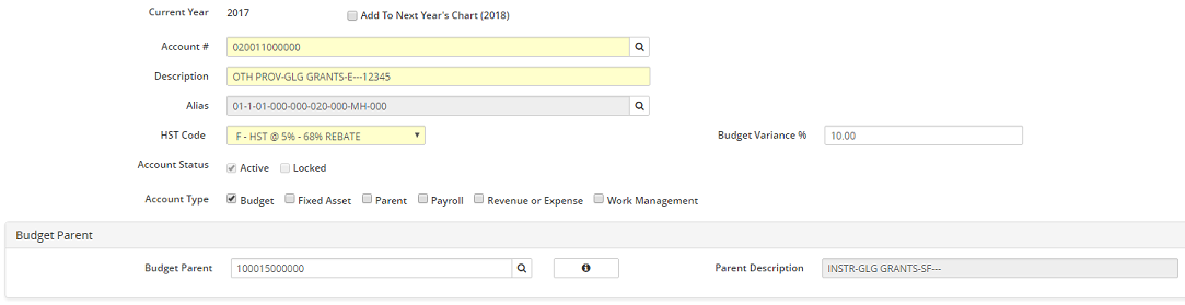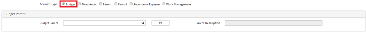 12. If applicable, if the Budget selection box is selected, enter a Budget Parent or click on the Search icon to search for a G/L Account.