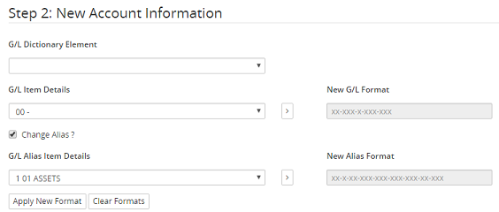 Note: To see the new G/L format, click on the arrow to the right of the G/L Alias Item Details field and the new format will display in the New Alias Format field.