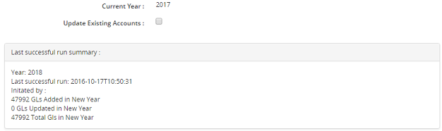 •Once a new chart of accounts has been created for next accounting year, further modifications to current year’s G/L accounts will not be reflected in the new chart of accounts. When the Year End process is run, any accounts that could not be found in the new year will be re-created with the exception of some deactivated accounts (as noted above).