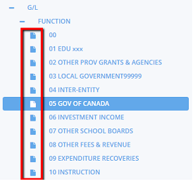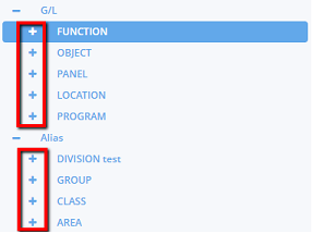 2. In the G/L Dictionary Editor screen, click on the plus symbol to expand the G/L or Alias element drop- down menu options.