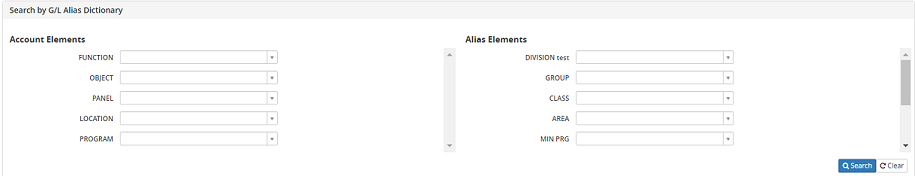 1. In the Search by G/L Alias Dictionary section, under the Account Elements and Alias Elements sections, click on the drop-down menu beside the corresponding element to select one or more options. Use the Search field to enter specific information, use the Select All button to select all available options, or use the Select None button to remove all selected options.