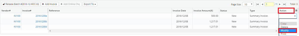 8. Click on the Action drop-down menu beside the corresponding invoice and select Modify.