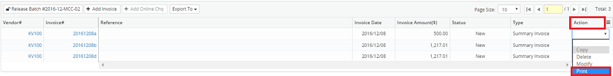 Invoices may be printed in the Invoice Management screen using the Print action.