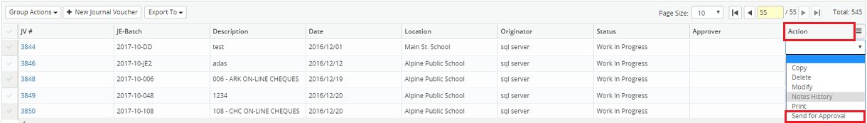 9. Click on the Action drop-down menu beside the corresponding journal voucher and select Send for Approval.