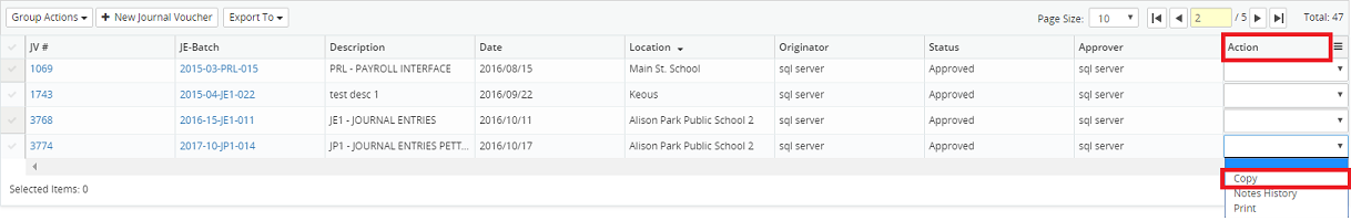 9. Click on the Action drop-down menu beside the corresponding journal voucher and select Copy.