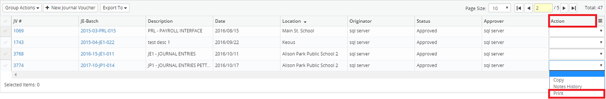 9. Click on the Action drop-down menu beside the corresponding journal voucher and select Print. A .pdf file will be created and downloaded.