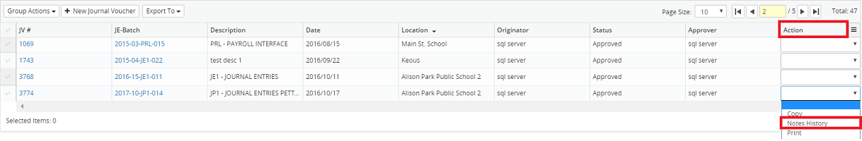 9. Click on the Action drop-down menu beside the corresponding journal voucher and select Notes History.