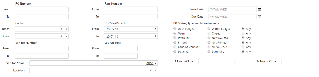 12. If applicable, in the PO Status, Type and Miscellaneous section, select one of the three radio buttons in each line. The Any radio button is selected by default in most lines.