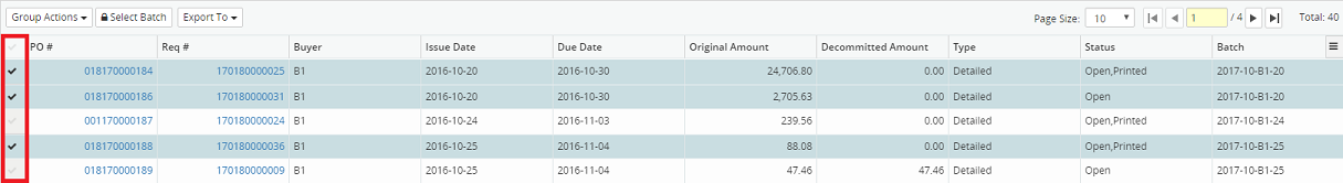 17. Select as many or as few PO's from the results displayed in the grid, by clicking the corresponding check mark beside each PO or click the check mark at the top of the grid to select all PO's.