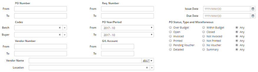 9. If applicable, in the PO Year/Period section, click on the From and/or To drop-down menus to select the year and period to search within a range. Default: Current year and period.