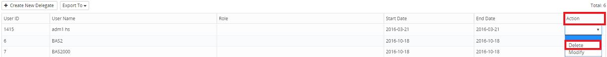 2. In the Requisition Delegates Management screen, click on the Action drop-down menu beside the corresponding delegate and select Delete.