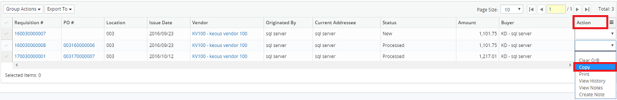 4. Click on the Action drop-down menu beside the corresponding requisition and select Copy.