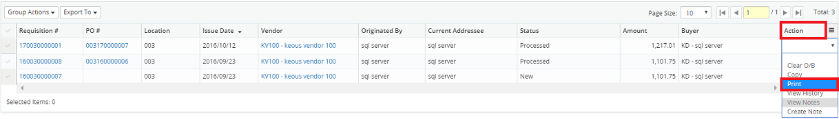 4. Click on the Action drop-down menu beside the corresponding requisition and select Print.