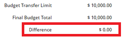 Note: The Difference must equal zero to allow budget transfers to be sent for approval.