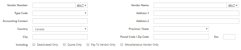 11. If applicable, In the Including section, select any of the following selection boxes: Deactivated Only, Quote Only, Pay to Vendor Only, and/or Miscellaneous Vendor Only.