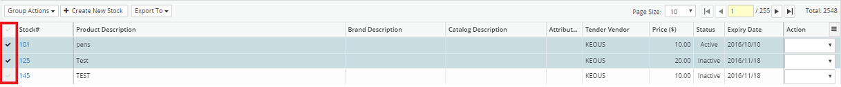 4. Select as many or as few stock items from the results displayed in the grid, by clicking the corresponding check mark beside each stock item, or click the check mark at the top of the grid to select all stock items.