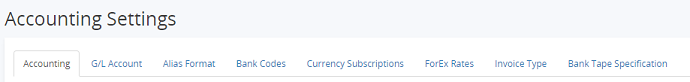 The general purpose of the Accounting Settings tabs is to create predefined values that provide defaults for the application. Once the defaults are defined, the Settings are not usually changed. However, some tabs allow for changes to be made, if necessary.
