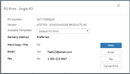 27. In the Delivery Method section, select one of the following buttons: Print (Hard Copy), Email or Fax. Click on the Cancel Print button to cancel the PO Print process.