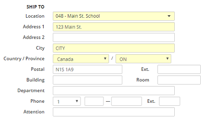 7. If applicable, enter or update the information in the following fields: Address 1, Address 2, City, Country/Province, Postal and Ext, Building, Room, Department, Phone and Ext. and/or Attention.