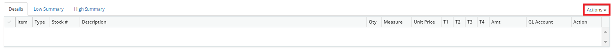 21. Click on the Actions drop-down menu above the grid and select Add New Detail Line to add a new detail line or Add New Description Line to add a new description line. The respective entry screens will be displayed. Enter the necessary data to finalize the line item entry. For step by step instructions on how to enter data in the Detail Line Entry screen, refer to How to Add New Detail Line or in the Description Line Entry screen refer to  How to Add New Description Line.