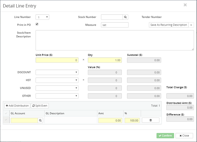 14. Click on the Confirm button to add the information to the purchase order grid or click on the Close button to return to the previous screen.