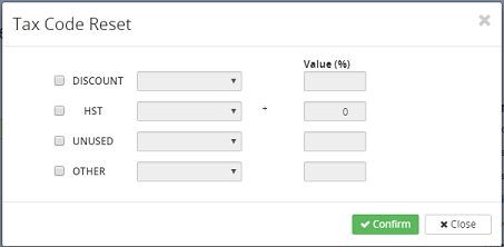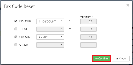 5. Click on the Confirm button to confirm the tax code reset or click on the Close button to return to the previous screen.