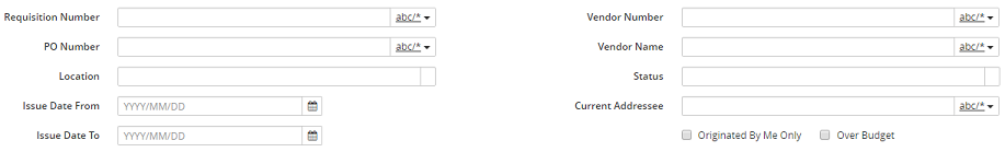 2. If applicable, enter the Requisition Number, Vendor Number, PO Number and/or Vendor Name and if needed, use the wild card search button for each.